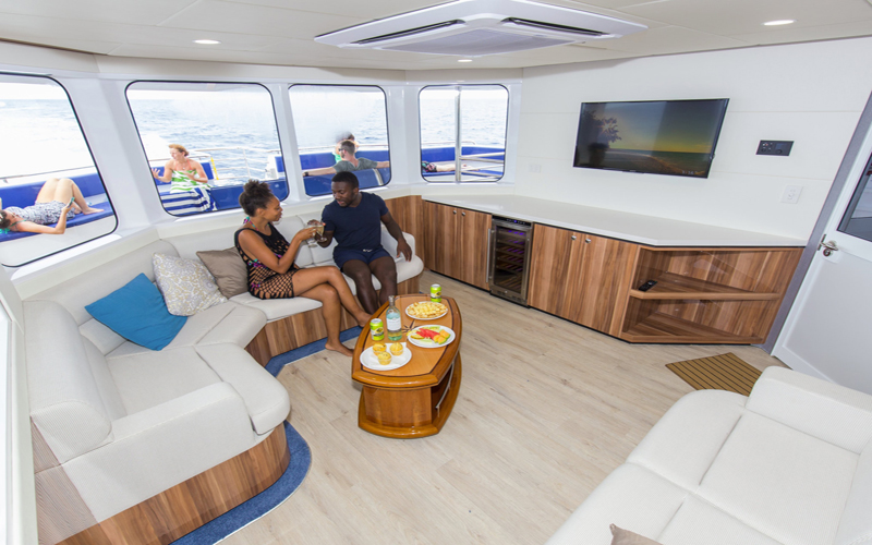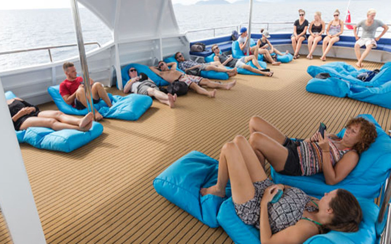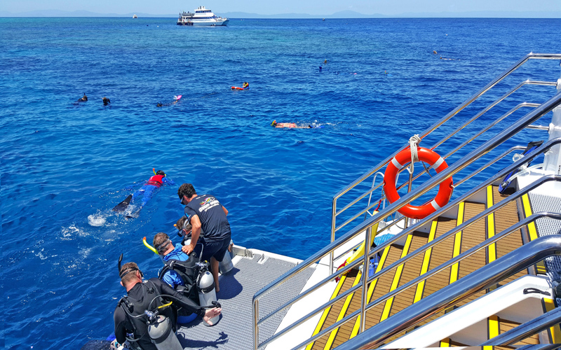 Level 1 deck is the water entry for divers and snorkelers. The steps submerge directly into the ocean, providing comfortable access for snorkellers and divers alike. The hydraulic dive platforms are the largest of any reef vessel for easy access in and out of the water.