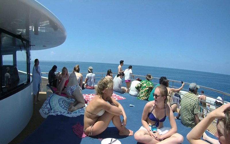 Level 2 is the air-conditioned middle deck which has plenty of comfortable bench seats with tables and lots of windows to enjoy the views. Outside you can sun tan to your heart’s content on the day beds fitted with soft material for added comfort while you relax. There’s also a seating area at the front and rear of the boat so you can soak up the views from whatever direction you desire.