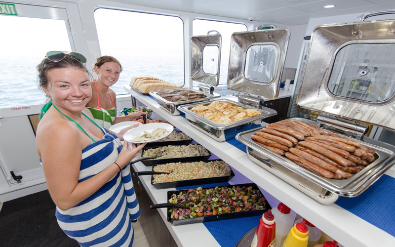 Lunch is a delicious Aussie BBQ lunch including prawns, fish, steak, vegetarian options, tropical salads and pasta. They can cater for guests with vegetarian, vegan, gluten and dairy-free diets. Please advise us at the time of your booking of any special dietary requirements and we will gladly assist where we can.